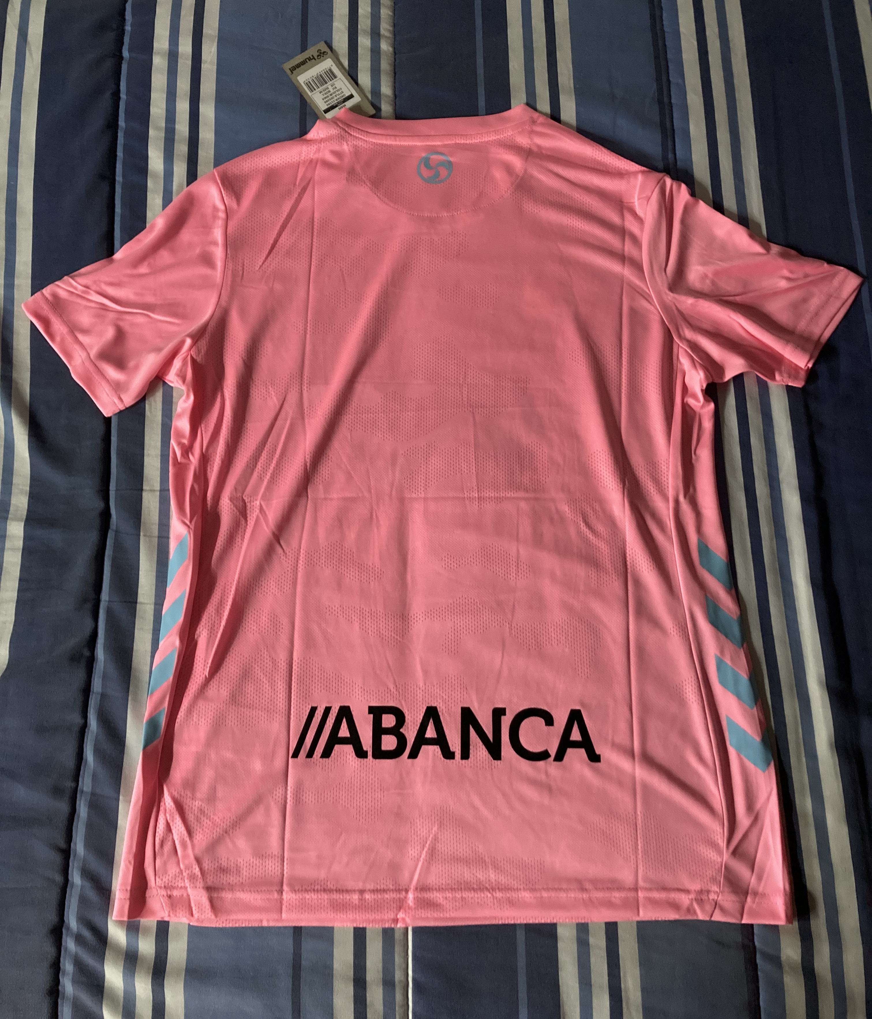 Es idéntica a la original, tanto la publicidad como las rayas que trae. Leí en algún lado que si los número son más pequeños que en la original, y eso no he podido comprobarlo, pero vamos, da totalmente el pego y si buscas una camiseta barata y bien, me parece una buena compra.